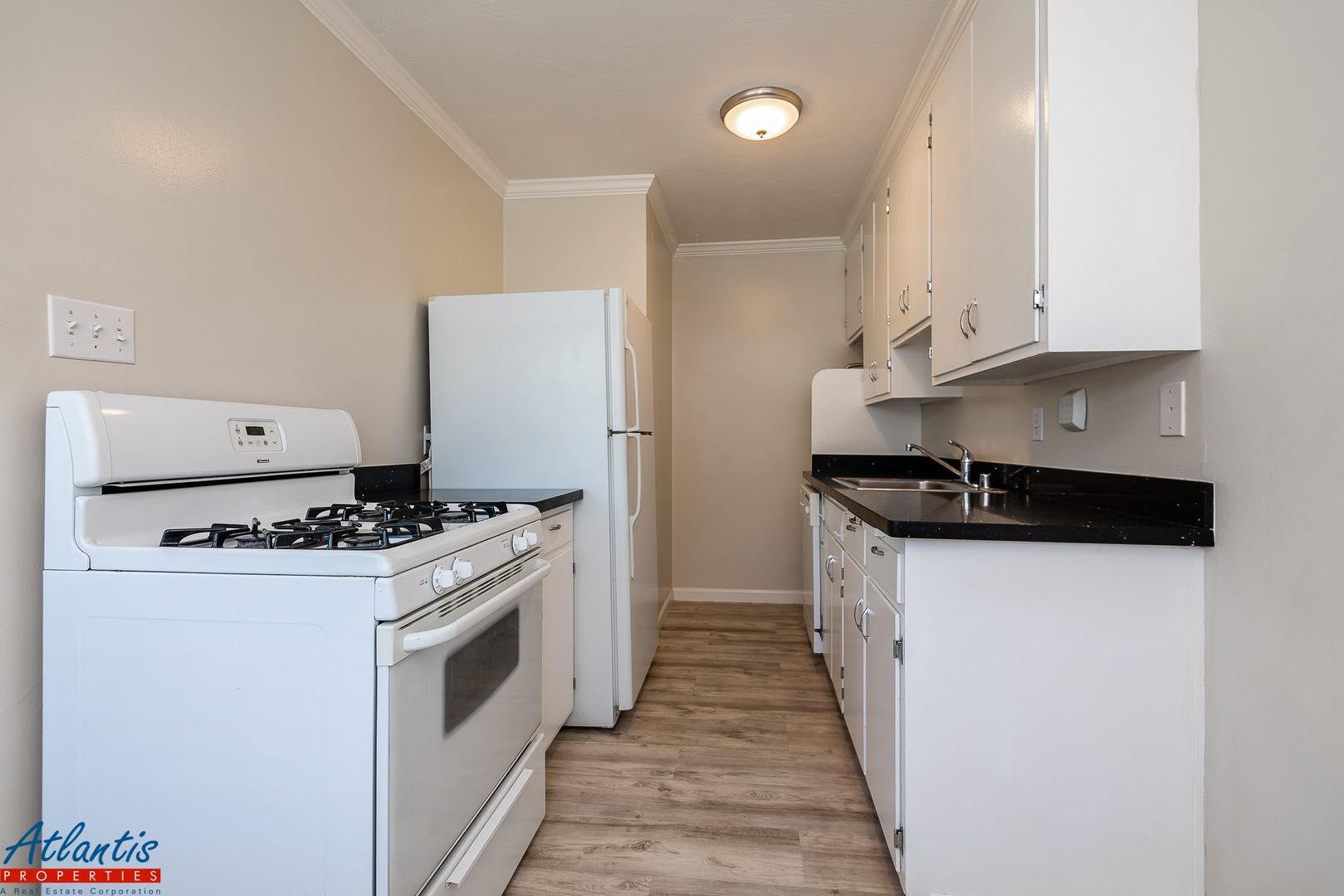 - Kitchen Features Designer Quartz Counters, Refrigerator, Gas Range/Oven, Dishwasher, Garbage Disposal & Ceiling Fan