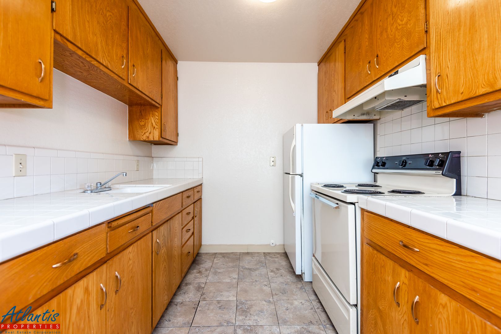 - Eat-In Kitchen Includes Tile Flooring, Tile Counters, Refrigerator, Electric Range/Oven & Garbage Disposal