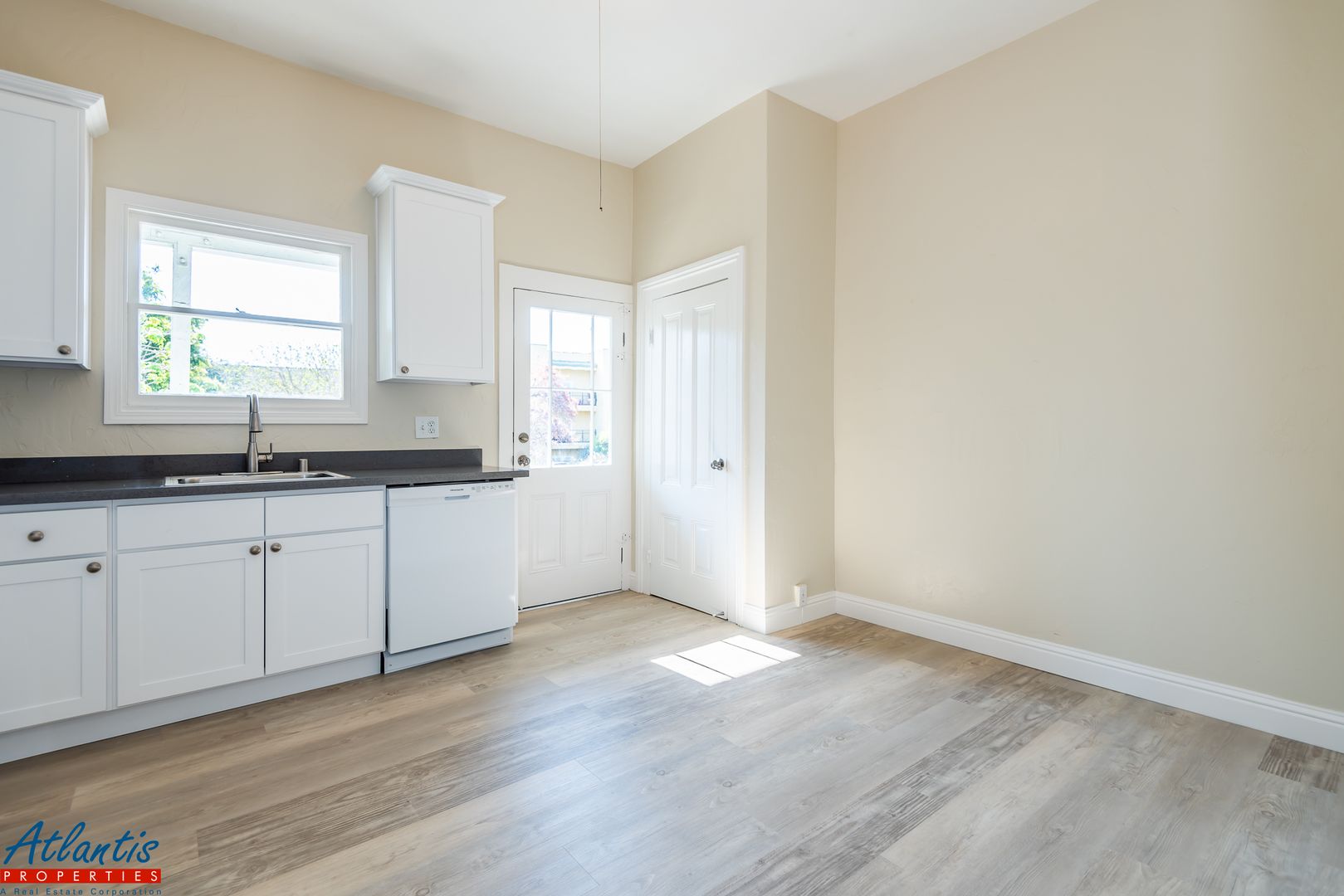 - Remodeled Eat-In Kitchen Features Shaker Cabinets, Sleek Quartz Counters, Refrigerator, Gas Range/Oven, New Dishwasher, New Built-In Microwave & Garbage Disposal
