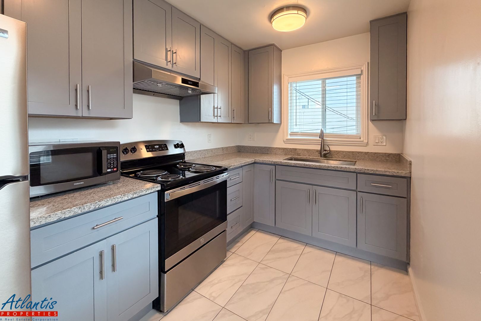 - Remodeled Kitchen Includes Stylish Shaker Cabinets, Granite Counters & Stainless Steel Appliances: Refrigerator, Electric Range/Oven (Microwave Not Warrantied)