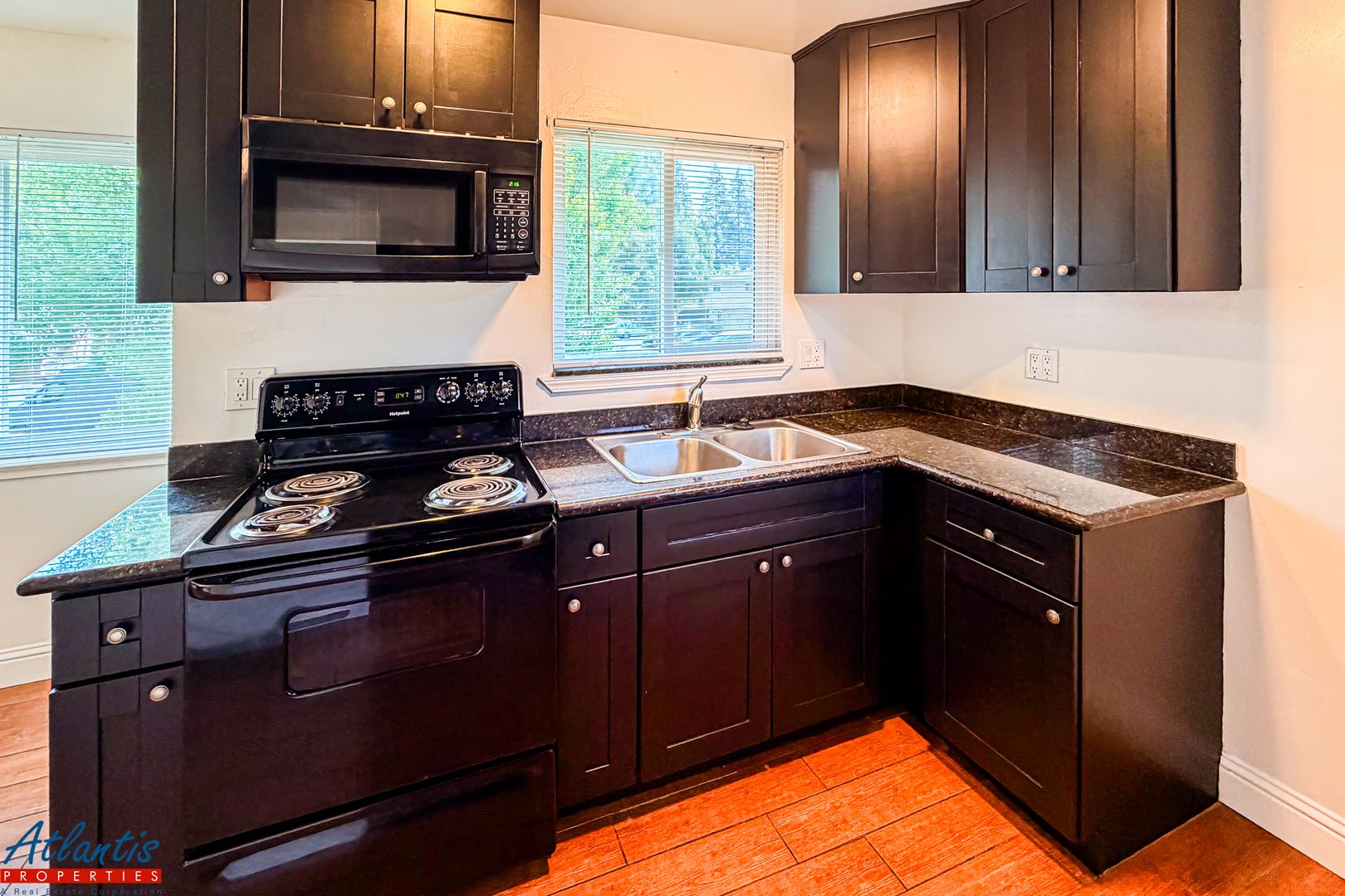 - Eat-In Kitchen Includes Wood-Look Tile Flooring, Shaker Cabinets Granite Counters, Refrigerator, Electric Range/Oven & Built-In Microwave