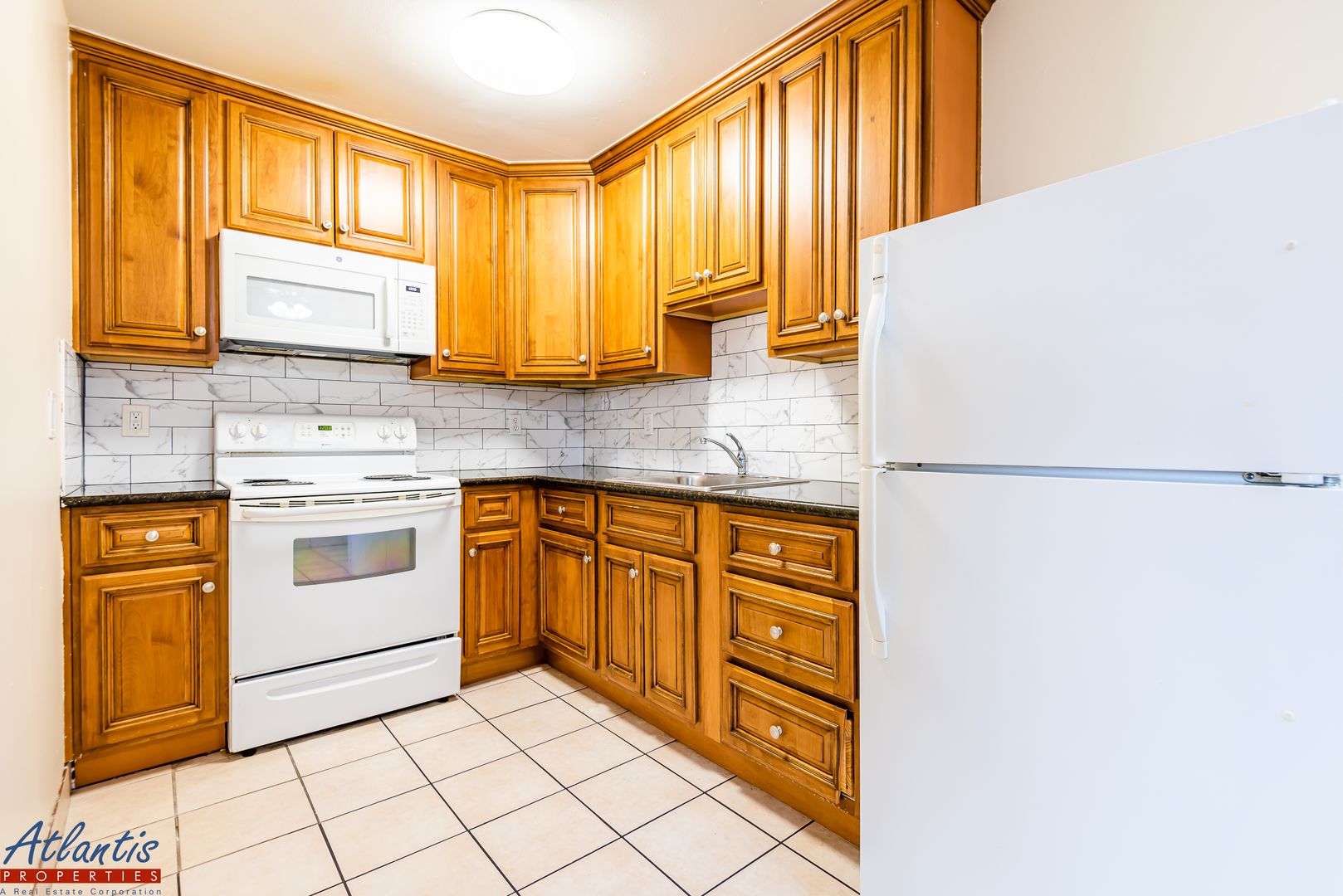 - Eat-In Kitchen Includes Tile Flooring, Wood Cabinetry, Granite Counters, Tile Backsplash, Refrigerator, Electric Range/Oven & Built-In Microwave