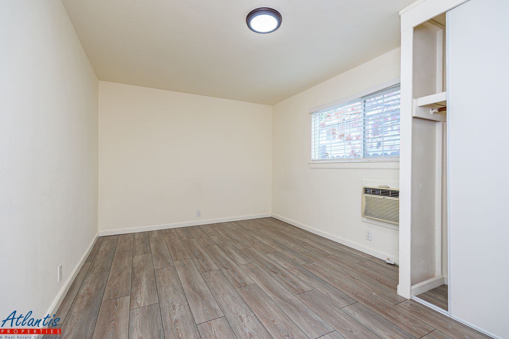 - Bedroom w/ Overhead Lighting, Wall Air Conditioning Unit & Two Closets